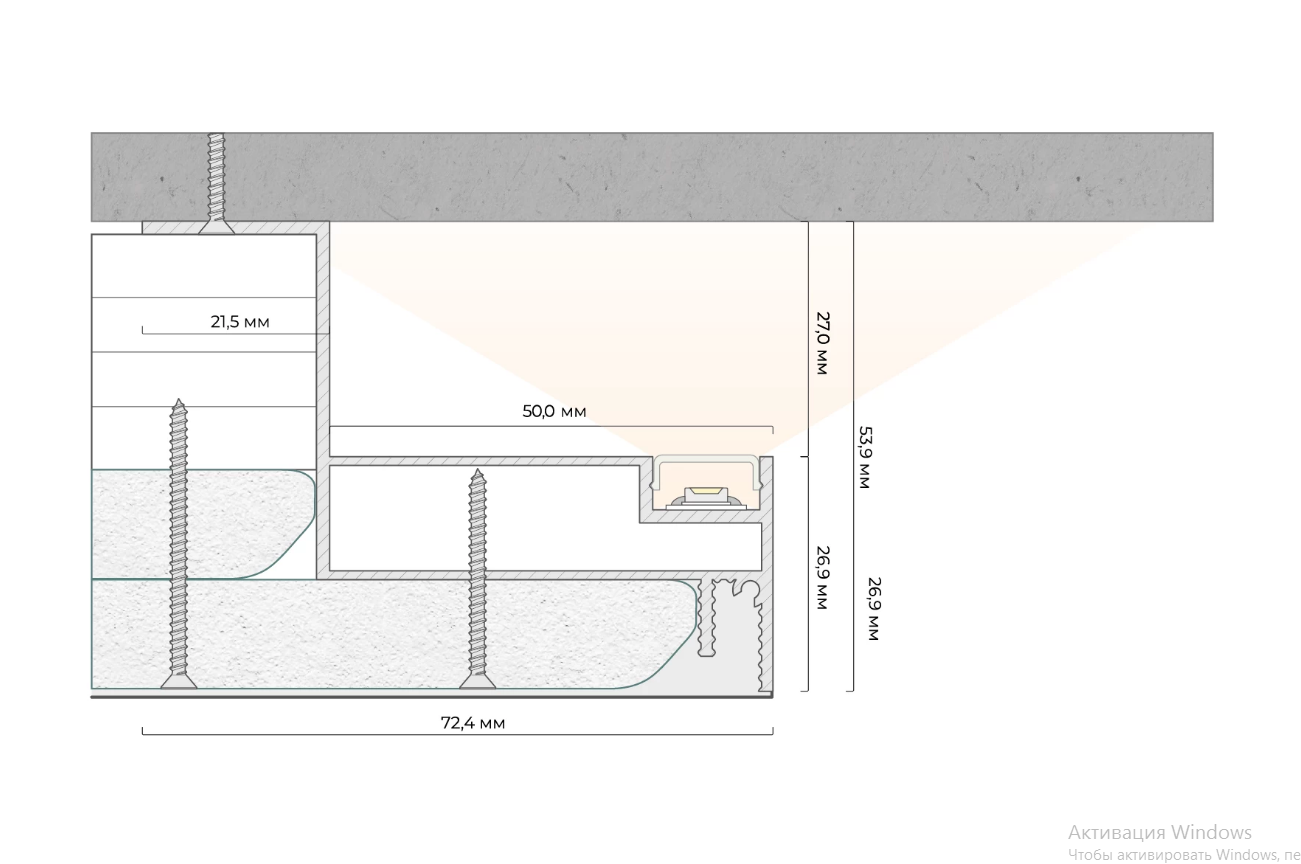 Скрытая подсветка: Конструкция предусматривает камеру для отвода тепла от светодиодной ленты и возможность установки светорассеивающего экрана для мягкого света .