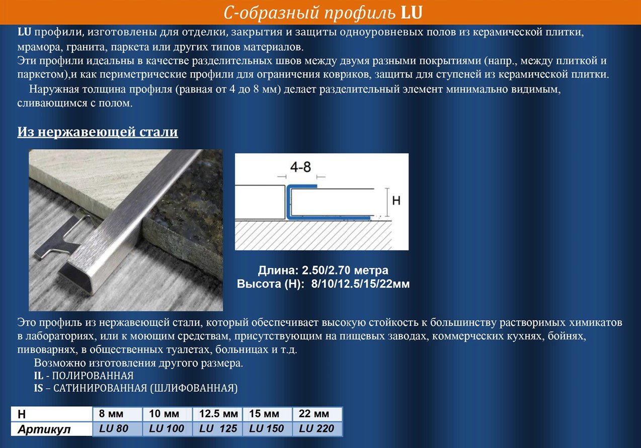 *Для совершения заказа LU 080IL C-образный профиль 8мм для одноуровневых покрытий полированная нержавеющая сталь необходимо выслать письмо запрос на почту: