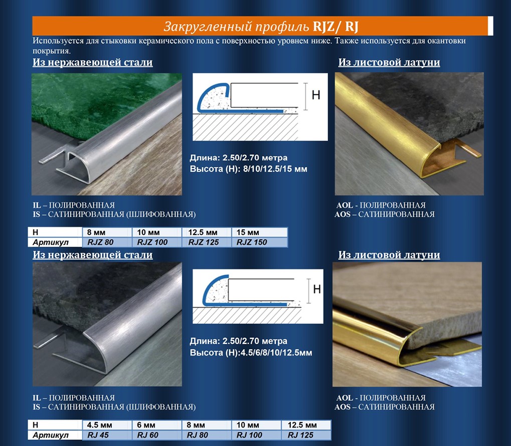 Закругленные профили RJ / RJZ — это эстетичное и безопасное решение для стыковки разноуровневых покрытий и окантовки. Плавная форма, выбор марки стали и цветового покрытия, а также возможность индивидуального изготовления позволяют адаптировать профиль под любую дизайнерскую задачу.